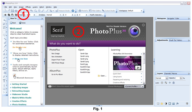 Serif's PhotoPlus X4 changed all that. Their common sense approach to program layout and design is equally blended with a powerful editing engine. My first pleasant surprise was to find that the instructional 'How To' files were displayed on the screen beside the working area. This was excellent, since they were NOT on a popup window overlapping the working area and you didn't have to go looking for them. My first thought was 'How novel, why hasn't anyone thought of this before?'