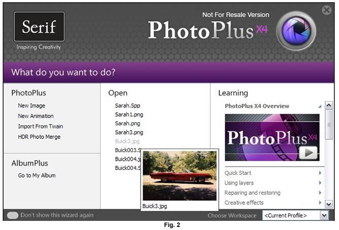 The next pleasant surprise was that after you had opened a photo to work on and saved it, the next time you opened PhotoPlus X4, an index showing the file(s) you had worked on previously were displayed by filename and when you moused over them a thumbnail photo of that file appeared. No more confusion as to which file(s) you were working on or what they were. (see fig 2) below: