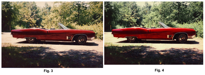 The first project I elected to try, was to see what I could do with an old photo of an old memory that had become yellow and faded with age, my 1968 Buick Wildcat (see fig 3) below. Using the 'Select from Twain' and 'Photo Fix' options and tweaking the slider adjustment bar to achieve the desired effect, I managed to restore the greens of the trees from yellow and restore the brilliant red of the car. Then using the 'Level Adjustment' feature and cropping the photo I managed to get the Buick back on level ground. (see fig 4) below: