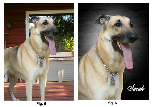 My next project was to take a photograph of my 'partner in crime', Sarah a 6 year old German Shepherd (see fig 5) below, and create a portrait photo suitable for inclusion on her web site column "Sarah Says". After scanning the photo and erasing the background, I added a new background layer and using the 'Filter Gallery' created a diffused spotlight and grained effect. Next, using the Text Tool I added her personalized signature. (see fig 6) below: